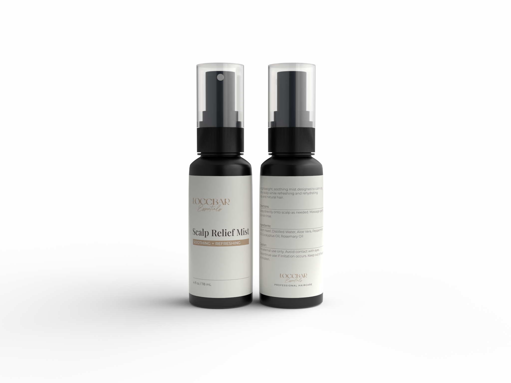 The LoccBar Essentials Scalp Relief Mist is a lightweight refreshing spray designed to soothe dry, irritated scalps while supporting healthy hair and loc maintenance.